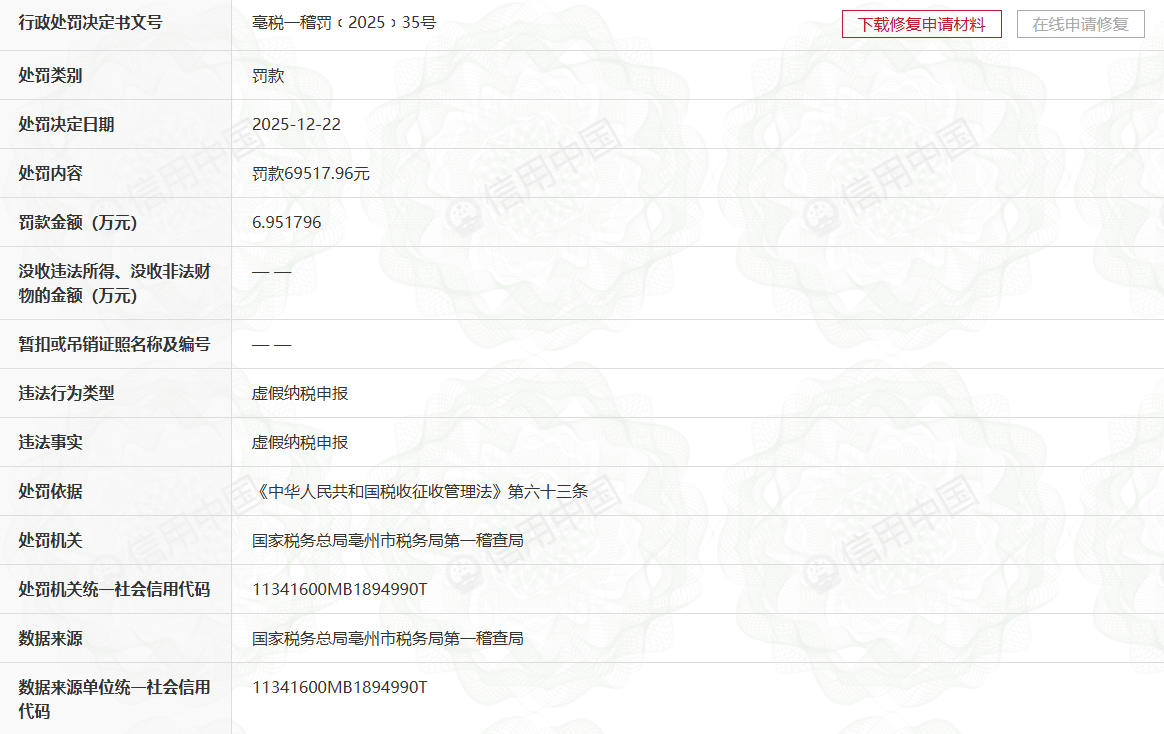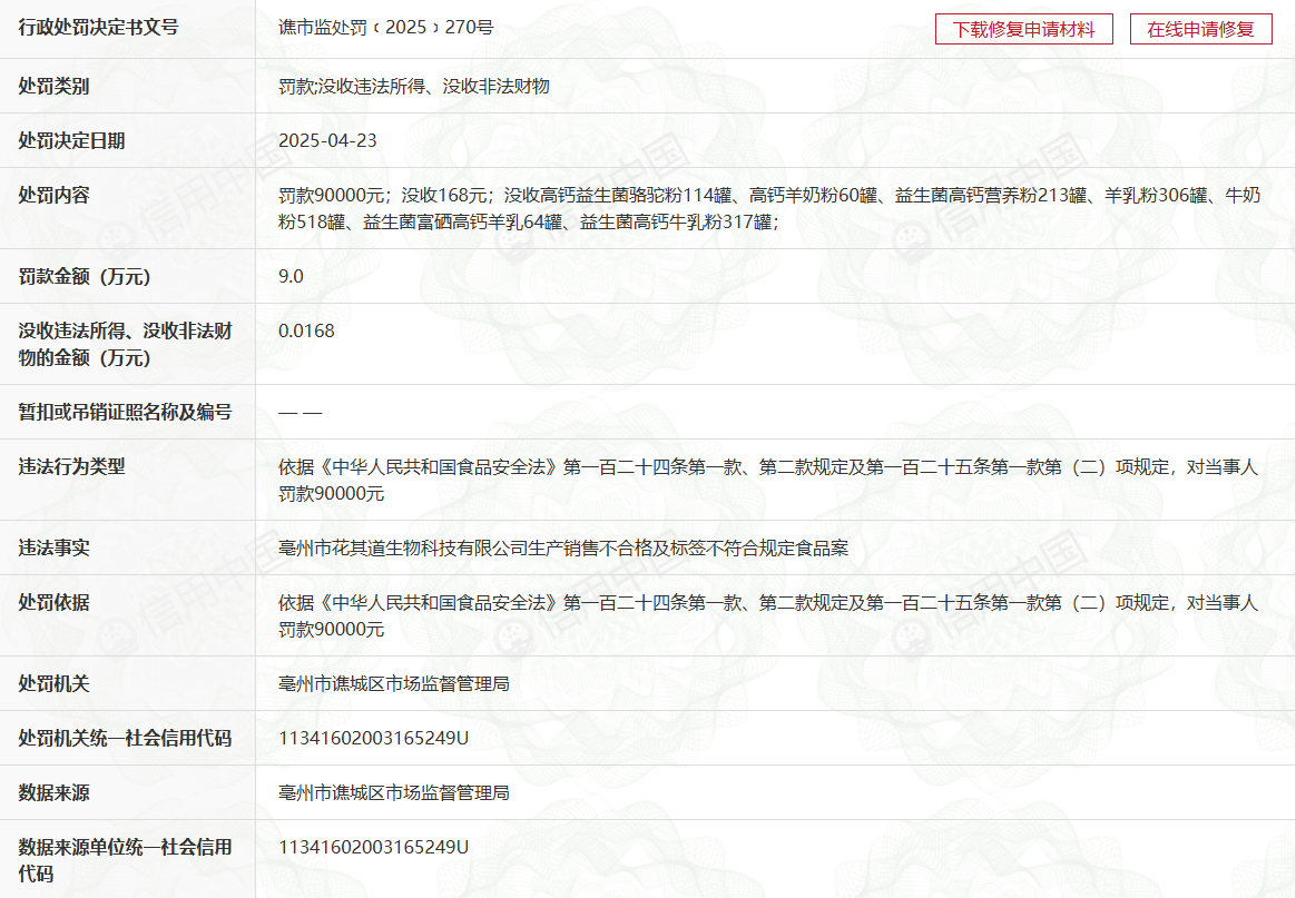 2025年,亳州市花其道生物科技无限公司先后因出产发卖不及格食物、虚假纳税申报问题,被市场监管和税务部分别离惩罚,年内累计罚款超15。95万元,出企业正在产质量量管控取税务合规层面的双沉缝隙。2025年4月23日,亳州市谯城区市场监视办理局做出谯市监惩罚〔2025〕270号行政惩罚决定,曲指亳州市花其道生物科技无限公司出产发卖不及格及标签不合适食物的违法行为。