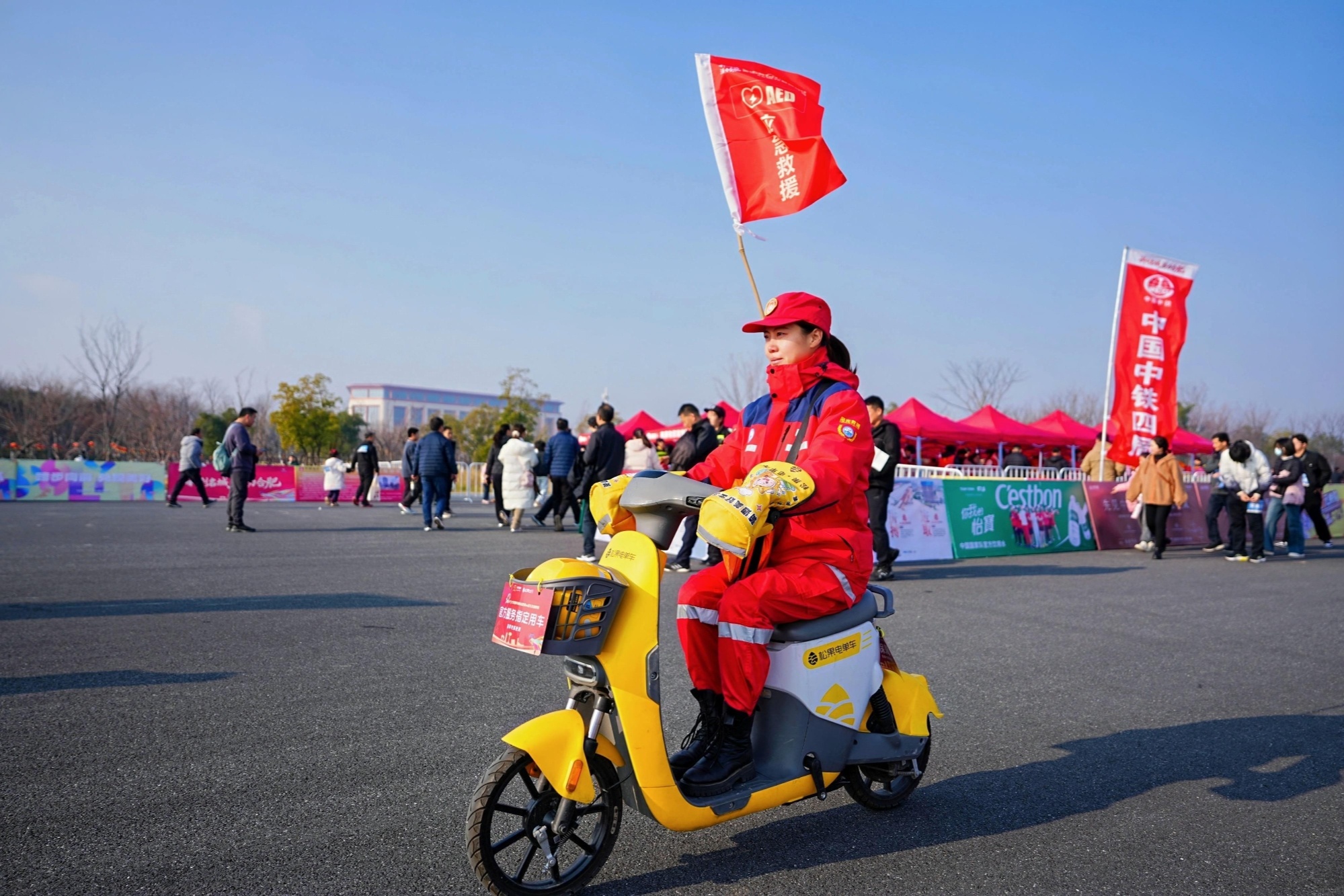 为保障赛事平安,赛事组委会正在赛场内设置了医疗点取医疗坐,配备医疗察看员、挪动急救员等医疗保障团队,还立异摸索共享电单车“救援+办事”模式,利用松果共享电单车做为医疗救援保障用车,“骑行AED”确保医疗工做者正在赛场上能随时响应救援,全方位守护选手平安,这一立异模式,也成为此次赛事平安保障工做的一大亮点。